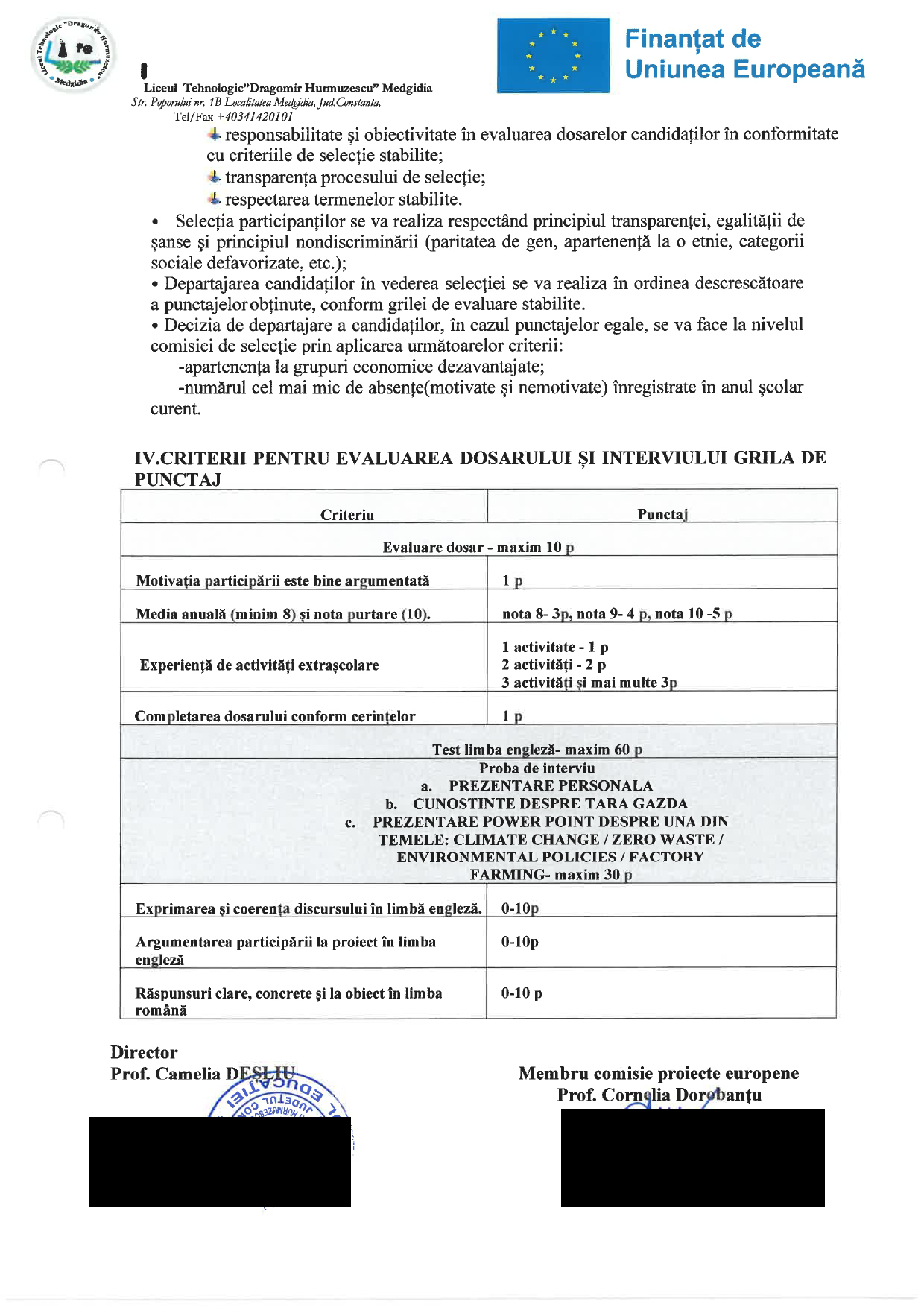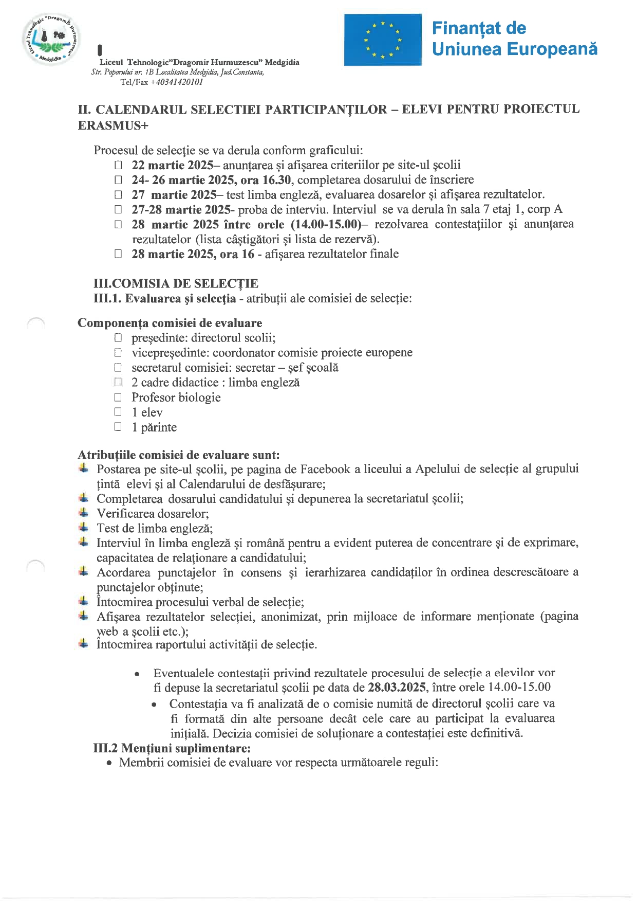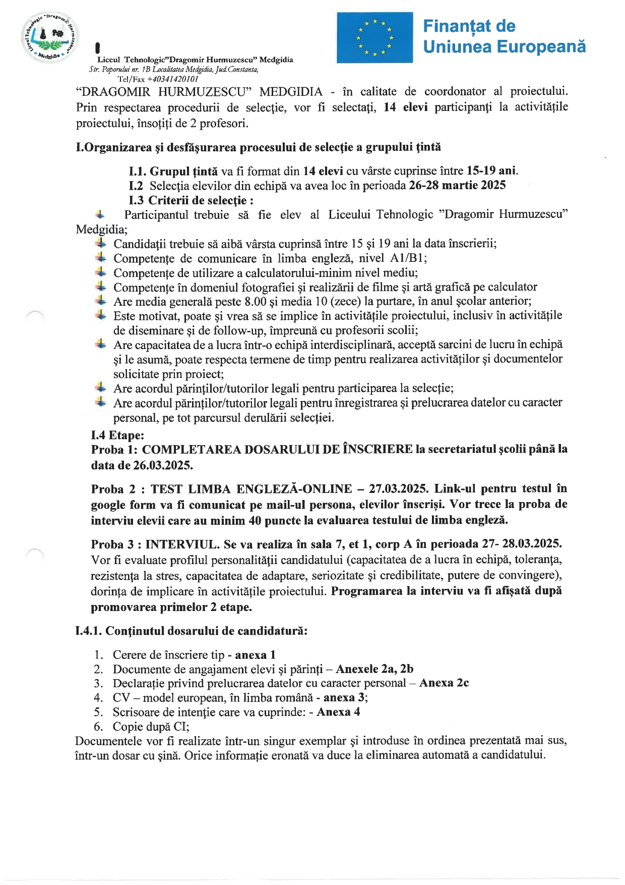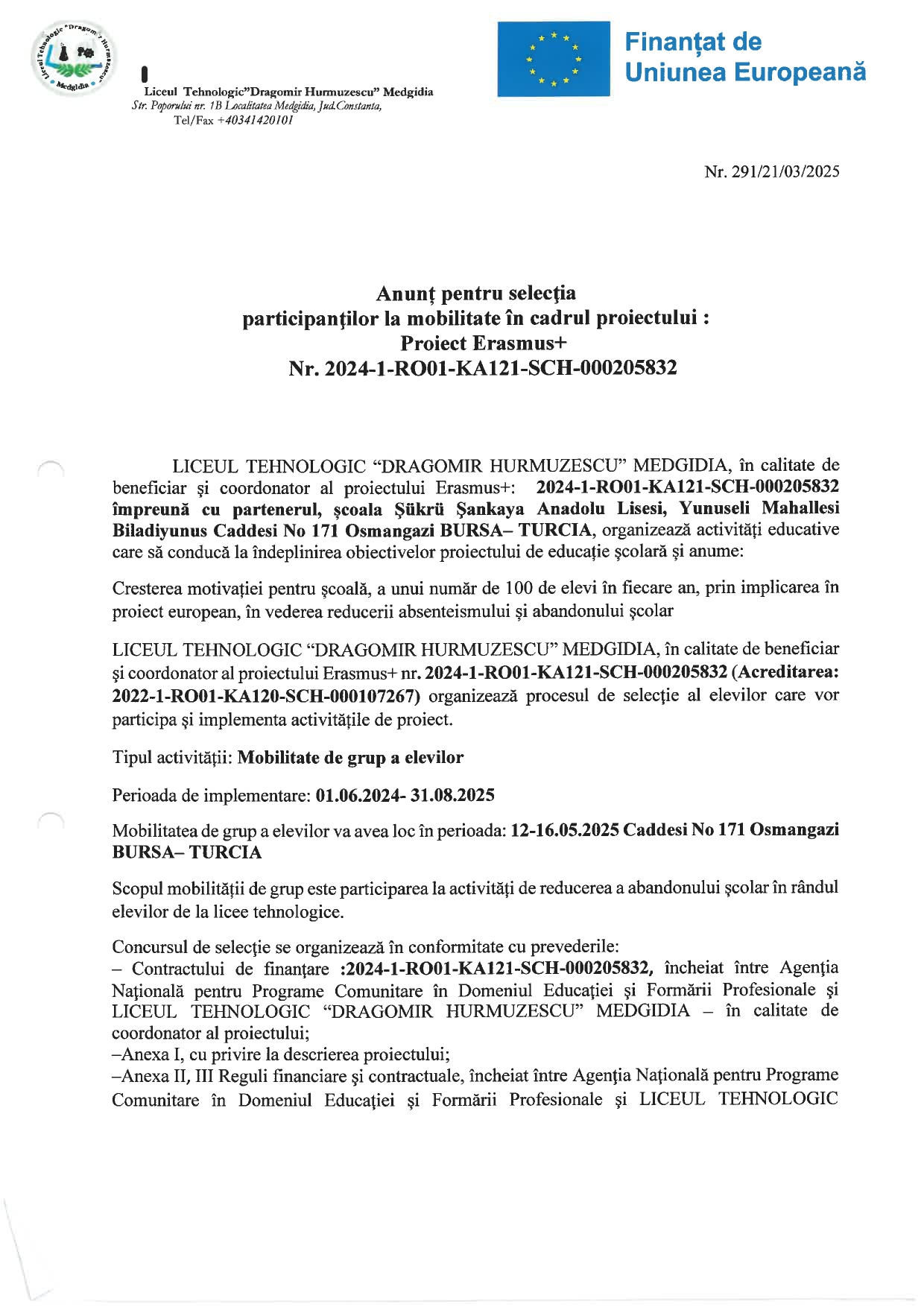 - Anunț pentru selecţia participanţilor la mobilitate în cadrul proiectului : Proiect Erasmus+ Nr. 2024-1-RO01-KA121-SCH-000205832